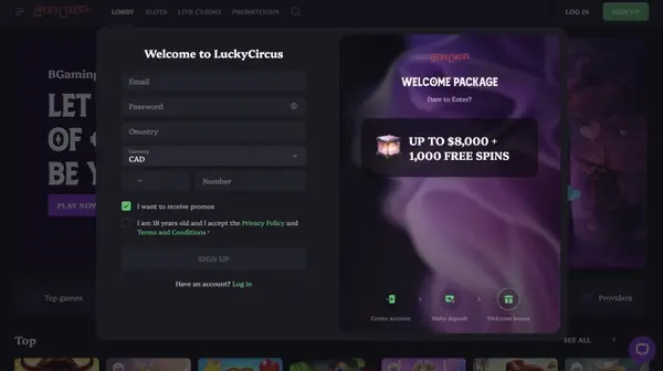 - Allez sur LuckyCircus et sélectionnez S’inscrire.